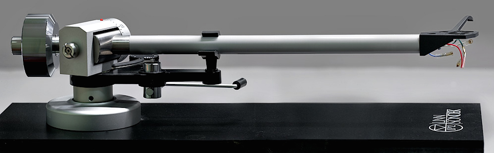 Arguably the first arm to espouse the maximum rigidity principle, the Ittok is built for strength. Its large bore alloy armtube is glued to a perforated magnesium headshell and a robust bearing assembly, housing standard ball races plus a stainless tool steel central shaft. Very finely aligned, these bearings offer a single, rigid coupling right through to the arm pillar with its three-point fixing. The sliding brass counterweight is decoupled to the rear end stub by hard rubber bushes, and thumbwheels set the spring-applied tracking force and bias. Cabling is very low capacitance and inductance copper, terminated by high quality gold plated Linn phono plugs. With an effective mass of 12g, the Ittok is in the medium to high mass category, meaning it will work well with most MCs and MMs alike.