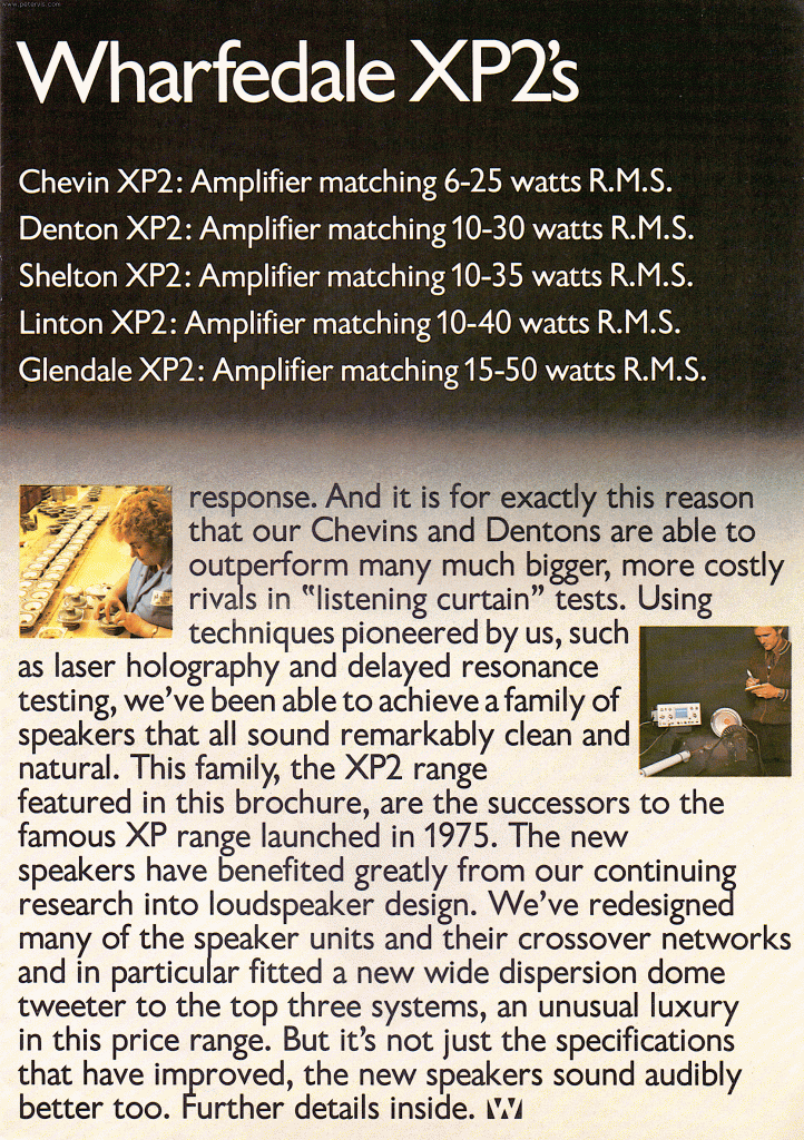The result was a five-product range with something for every budget buyer. The Chevin XP2 was largely unchanged. handling 20 watts (DIN) and cost £37 per pair. The Denton XP2 got two new driver units, handled 25 watts and cost £53. The new Shelton XP2 had a power handling of 28 watts, and cost £65. The Linton XP2 took 35 watts and cost £80; it received new bass and treble units, plus the midrange driver from the old Linton 3XP. The Glendale had a power handling of 40 watts, and cost £105; it used the same midrange and treble units as the Linton, but with a completely new woofer. The stick-on plaque was deleted, and the front baffle was moved forward so it was flush with the front of the speaker when the grille was fitted.